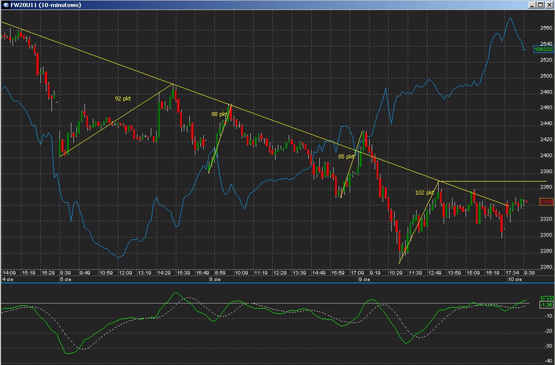 Strategia gry to pozycje krótkie po 2655 pkt ze stopem na 2400 pkt. Jeżeli będzie duża luka hossy to grałbym przeciw niej nawet jeżeli pozycje wylecą na stopie. Po takich spadkach brak zamknięcia luki przeciw trendowi byłby historycznym wydarzeniem.
