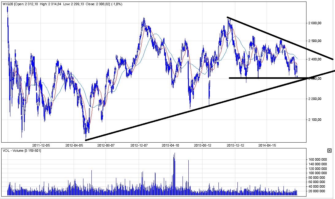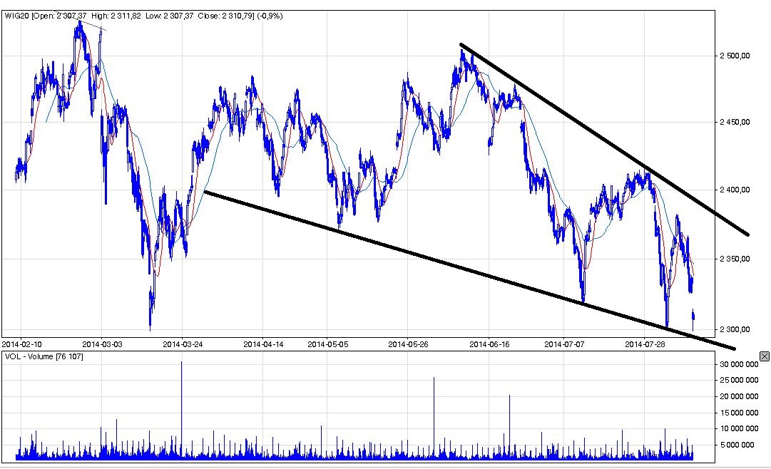 Wobec klimatu z poprzednich sesji również i koniec tygodnia nie sprzyja wyciąganiu rynku tak więc zgodnie z poprzednimi prognozami zapewne zanotujemy nowe minima obecnego ruchu.