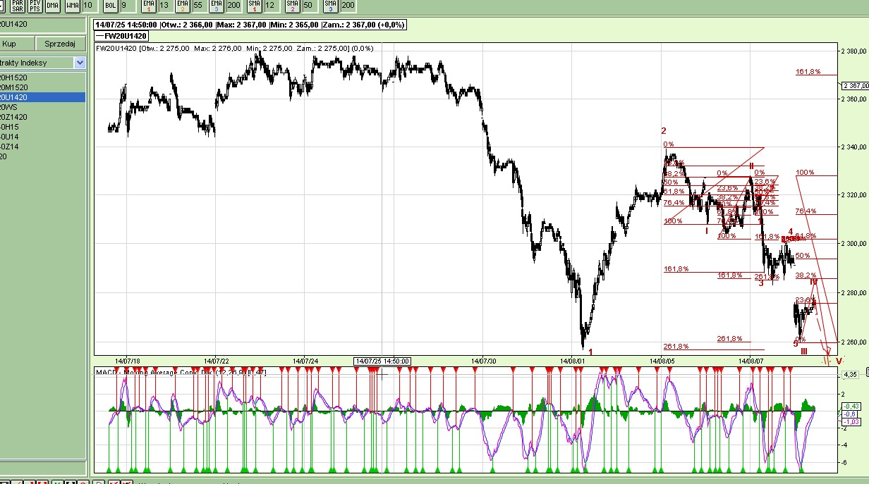 Andy, patrząc na długość ruchu 2380-2260 (oznaczona jako 1) nie sądzisz, że ta ostatnia zwałka (od wtorku do dziś) musi być jakąś jedynką w bardziej rozbudowanej trójce ? Bo dynamiki "dużej trójki" jeszcze nie mieliśmy. Jeśli to zagra to marnie widzę utrzymanie obecnych poziomów.
