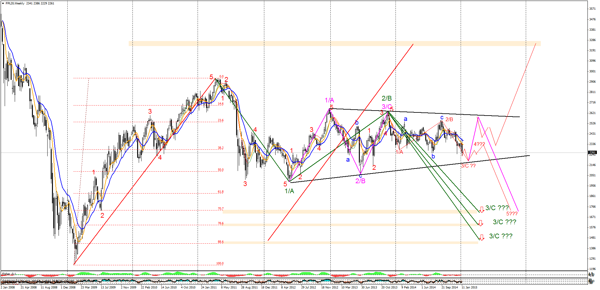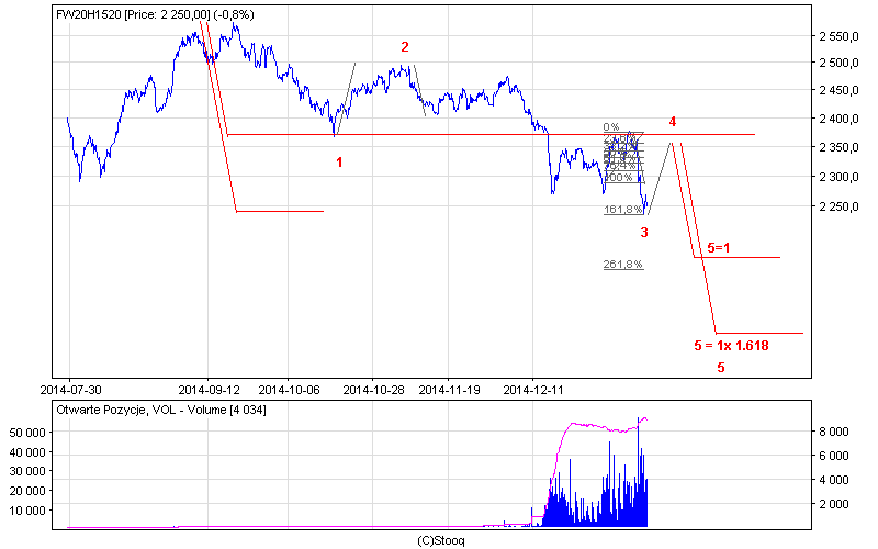 Przekopanie górą 2360-70 pkt pokaże że to co spadało to było ABC co zaproponował nam w piątek Axes i przed nami wieczna hozza ;). Zatrzymanie ruchu przed wspomnianymi poziomami i zwała oznacza że zaczynamy kręcić 5 z zasięgami jak na wykresie (szerokie okolice 2150 lub 2050 pkt).