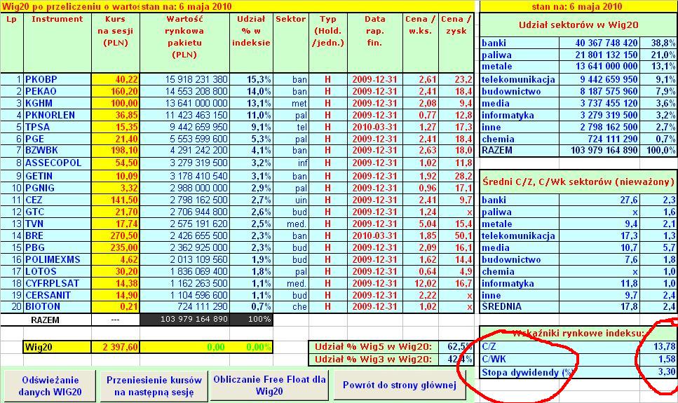 W dłuższym terminie w przypadku uspokojenia nerwówki na rynkach, warto zwrócić uwagę na statystyki indeksu, który po ostatnich spadkach "skurczył" znacznie wskaźniki rynkowe. Dodatkowo ulegną one poprawie po opublikowaniu wyników za I kwartał przez spółki (nie wiadomo czemu gpw aktualizuje oficjalne wskaźniki nie na bieżąco, tylko po ... tygodniu (?) od podania wyników - w oficjalnych statystykach tylko tpsa i bre mają uwzględnione wyniki za I kwartał).