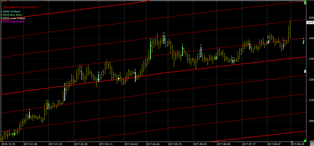 Na wykresie z liniami Marsa niestety nie udało się pokonać oporu na poziomie 2380 pkt. Mamy już wyraźne odejście. W takiej sytuacji rynek najpewniej będzie szukał wsparcia a nie atakował szczyty. Najbliżej jest linia na poziomie ok. 2300 pkt. i tam rozegrają się dalsze losy ruchu wzrostowego zapoczątkowanego pod koniec zeszłego roku. Na niebie w poniedziałek 21.09.17 mamy nów, wzmocniony zaćmieniem Słońca. Może to zintensyfikować ruch w danym kierunku lub utworzyć zwrot.