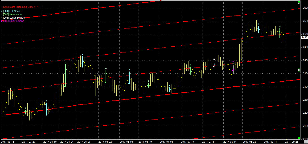 O wykresie z liniami Marsa niewiele można powiedzieć. Byki broniły zdobyczy przed zamknięciem serii i nie były zainteresowane podnoszeniem indeksu, a tym samym wyceny kontraktów. Niedźwiedzie były za słabe by go obniżyć. Stąd boczniak ponad linią wsparcia na poziomie 2480 pkt. Dopóki ta linia nie zostanie przebita dopóty byki będą miały kontrolę nad rynkiem. Wyjście dołem zdynamizuje handel. Jeśli chodzi o niebo to 20.09.17 będzie nów, który może być dobrym przyczynkiem do wyjścia z boczniaka w którymś z kierunków.