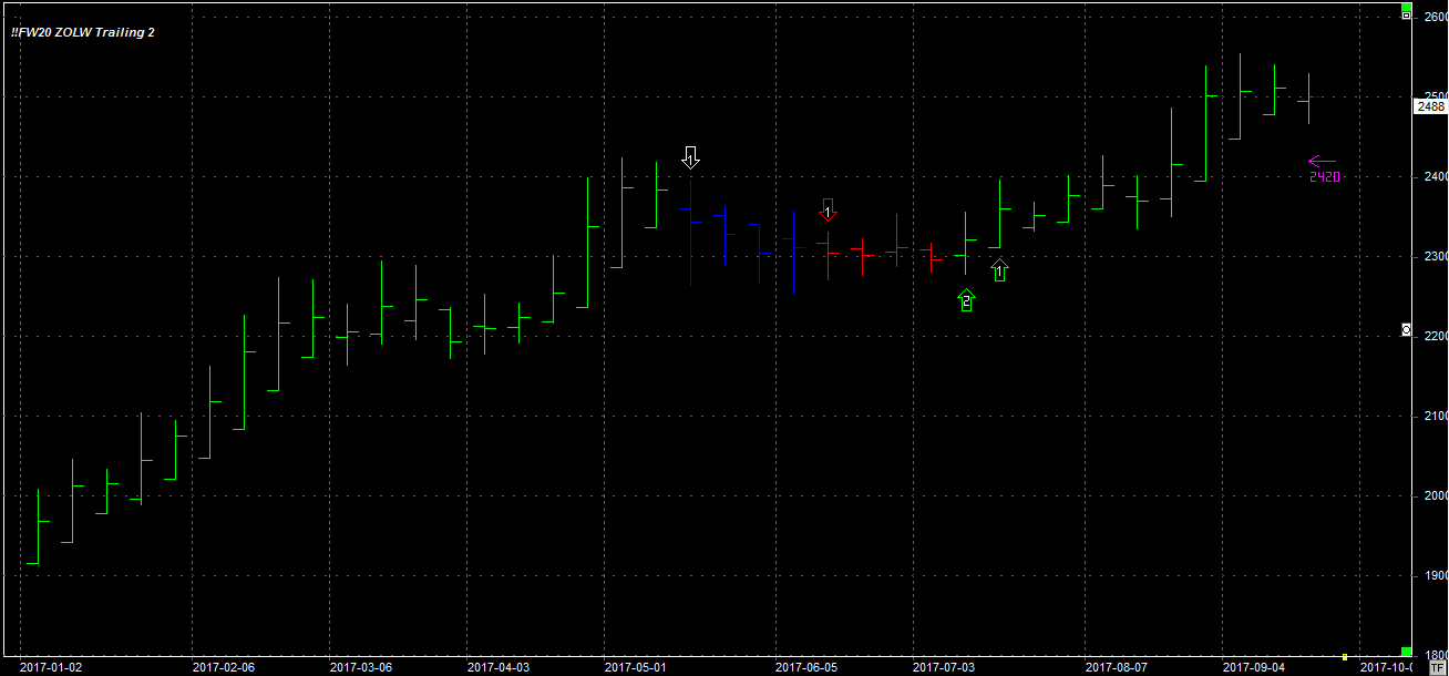Tydzień zamknął się na poziomie 2488 pkt., 17 pkt. niżej niż tydzień temu. System utrzymuje 2 długie pozycje po 2349 pkt. (średnia z dwóch transakcji). Stop dla pozycji 2420 pkt.