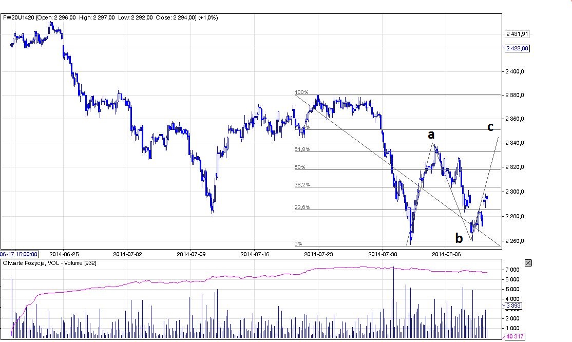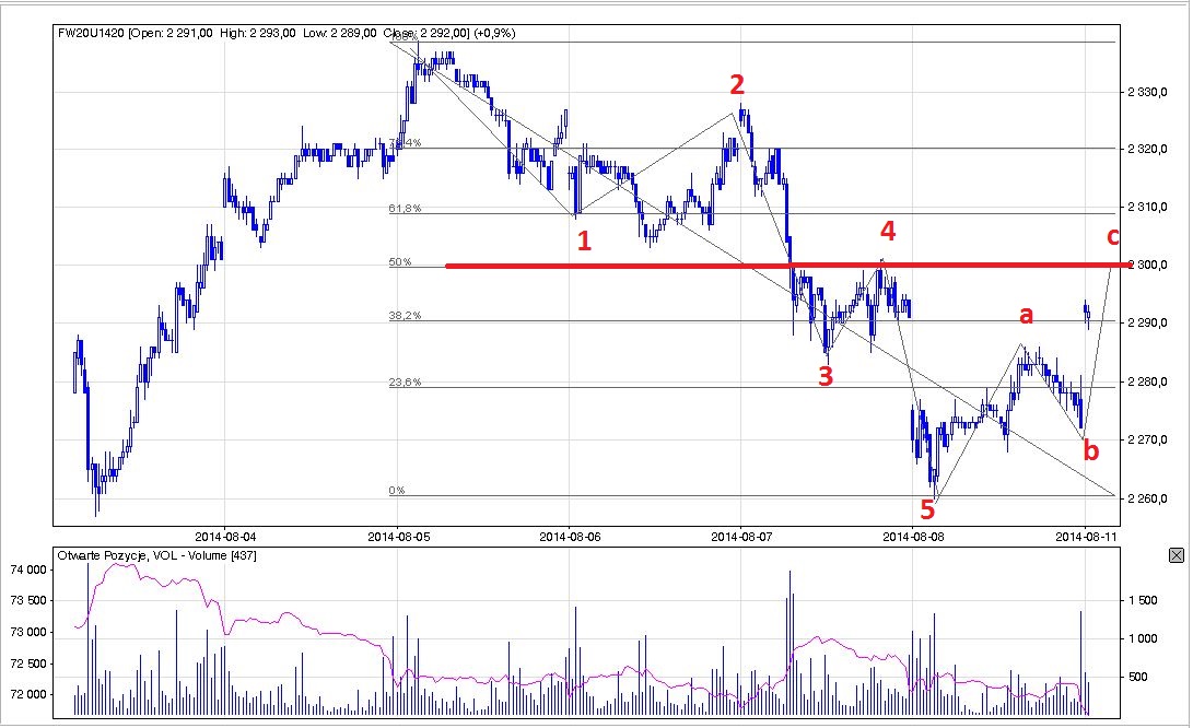 2014-komentarze-piatek-t4327.html#p27265 zakłada, że nie jesteśmy w 4 tylko robimy korekcinę całego spadku. Warto uważać na 50% fibo w okolicy 2300 gdzie mamy również równość c=a (2298). Chwilę po openie zabrakło 4 pkt, czyli jakby się uparł to może być po :) Zamknięcie dzisiejszej luki intra powinno potwierdzić koniec upa.