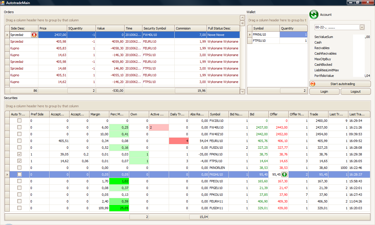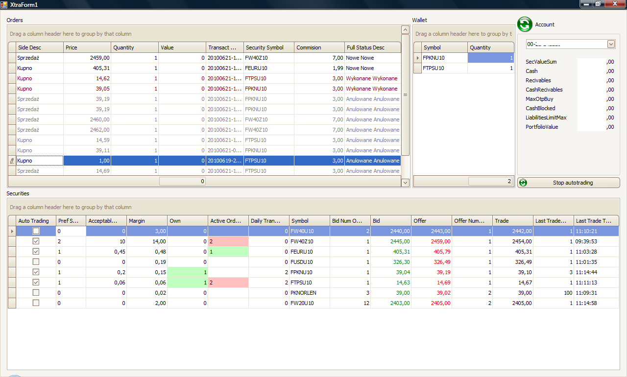 p4wgpw napisał(a):No to jeszcze jeden obrazek bo przez jakiś czas nie przewiduję zmian w interfejsie. Dołożyłem m.in. możliwość składania zleceń oraz anulowania za pomocą dodatkowych przycisków na liście.
