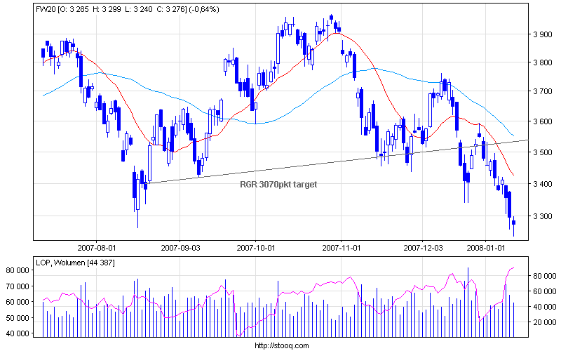 Moja hipoteza jest taka, że mielibyśmy dzisaj już pełne wyprzedanie, tylko nie wiem co w takiej sytuacji myśleć o mediach, kóre trąbią o recesji, krachu itp. Zastanawiam sie czy fundy nie sprzedawały, żeby mieć kasę - obroty ostatnio były spore, szczególnie na spółkach ulubionych przez fundy. Do tego mieliśmy w zeszłym roku sporo kasy wpłaconej do fundów, ale trzymanej na czarną godzinę - świadczyły o tym komunikaty o wpłatach i brak wzrostów, a nawet spadki na MW40 i W20. Znaczy się fundy mają sporo kasy, ale jej nie poświęcą na obronę rynku, bo nie warto być frajerem, który poświęci się dla innych. Natomiast jak będzie odbicie, to mogą starać się zagrać na pobicie rynku i wejście w dołku. To, plus rosnący LOP może być zabójcze dla miśków, dlatego ja już na krótkich nie siedzę.