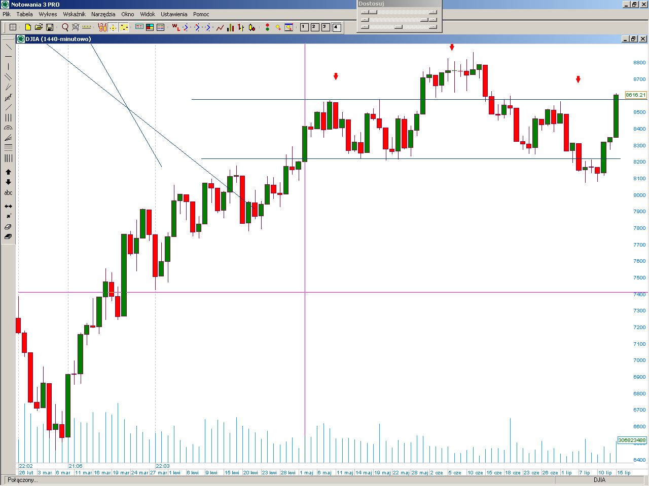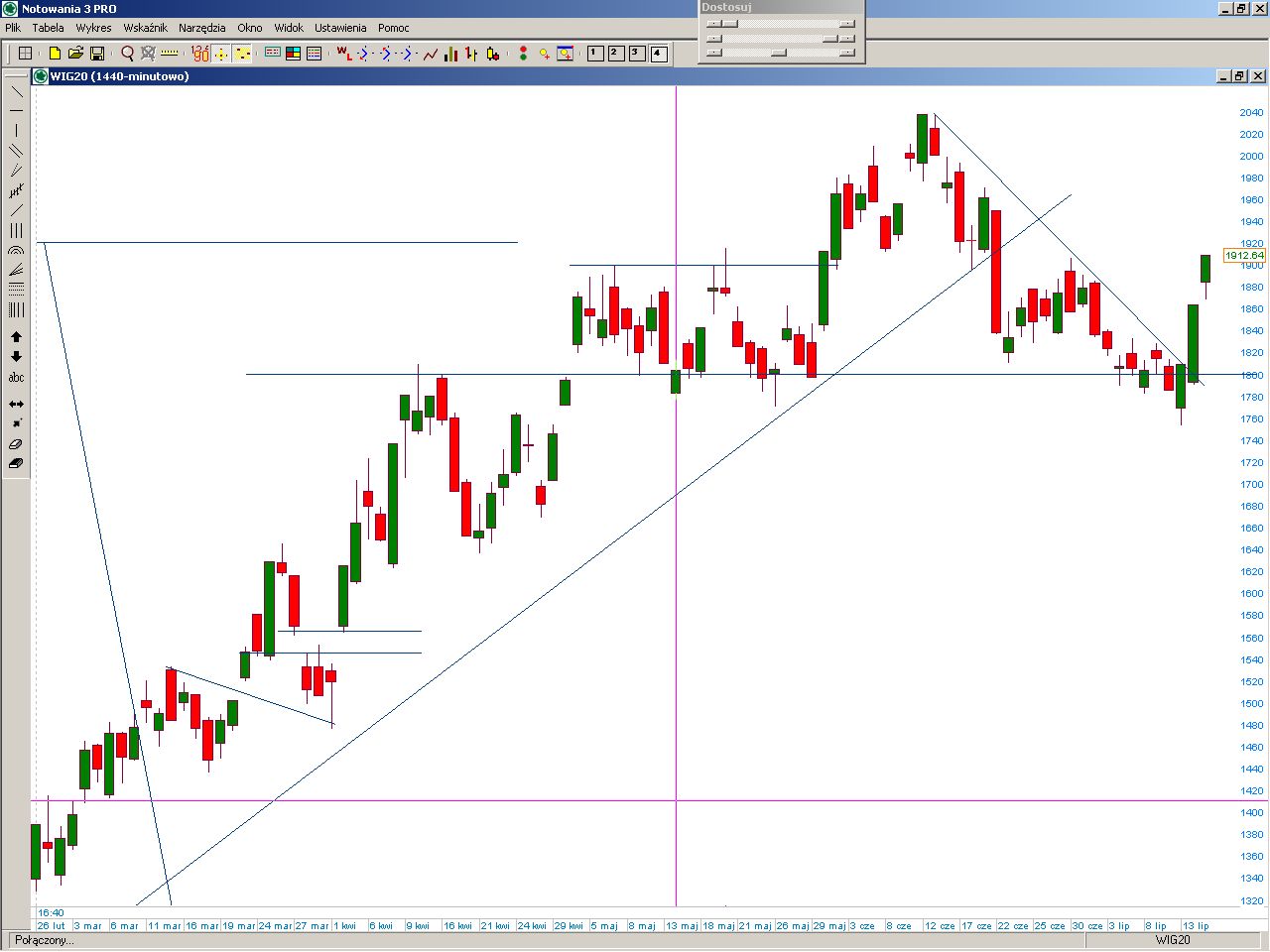Dawno nie udało mi sie tak błednie zinterpretowac rynku. Zejście poniżej 1750 pkt i szybki powrót ponad ten poziom okazal sie pułapką. Obecnie na wykresie day mamy 3 silne prowzrostowe świece. Dzisiejsze zamkniecie na indexie wypadło powyżej połowy długiej czarnej swiecy z 22.06 i powyzej ostatniej górki. Przeslismy także 66% fib co imo oznacza marsz na ostatni szczyt. Na wykresie intra kontraktow mamy 2 luke pomiarowa co daje minimalny zasieg zwyzki w okolice 1960 pkt. Czy dojdzie do podwojnego szczytu, czy wybijemy sie wyzej a moze indeksy zachodnie pomoga zakonczyc czas bessy??? Waluty na pewno sa teraz po stronie byczkow , sprzyja im tez pogoda i czas wakacyjny:))) System el , jutro czas uzupelnien ew dziale.