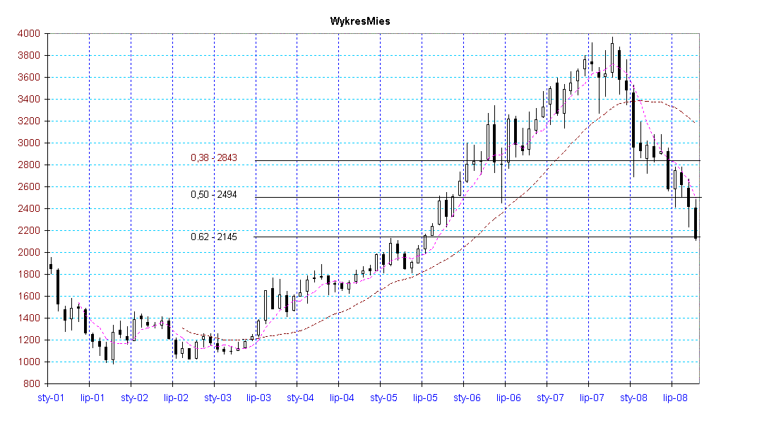 Ciekawie wygląda wykres kontynuacyjny na miesięcznych świeczkach od początku tego wieku Te fiba narysowałem sobie TYLKO i wyłącznie jako ciekawostkę. Rynek na PEWNO nie może mieć tak długiej pamięci. A zresztą gdyby miał, to i tak nic z tego nie wynika