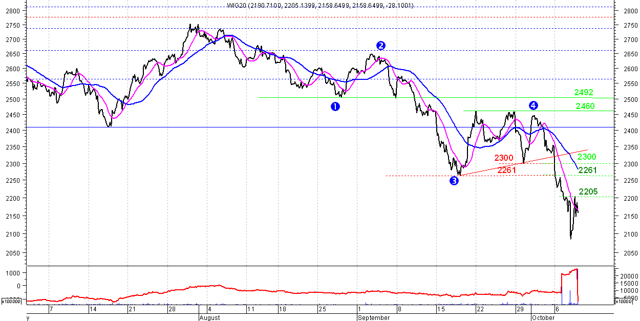 Teoretycznie moze to oznaczac mozliwe zakonczenie tego impulsu i rozpoczecie "wiekszej" korekty, jednak dopiero pziom 2334 na zamkniecie dnia da pewnosc, ze TA fala spadkowa sie skonczyla. Na intra ten poziom jest nizej - ok.2300.