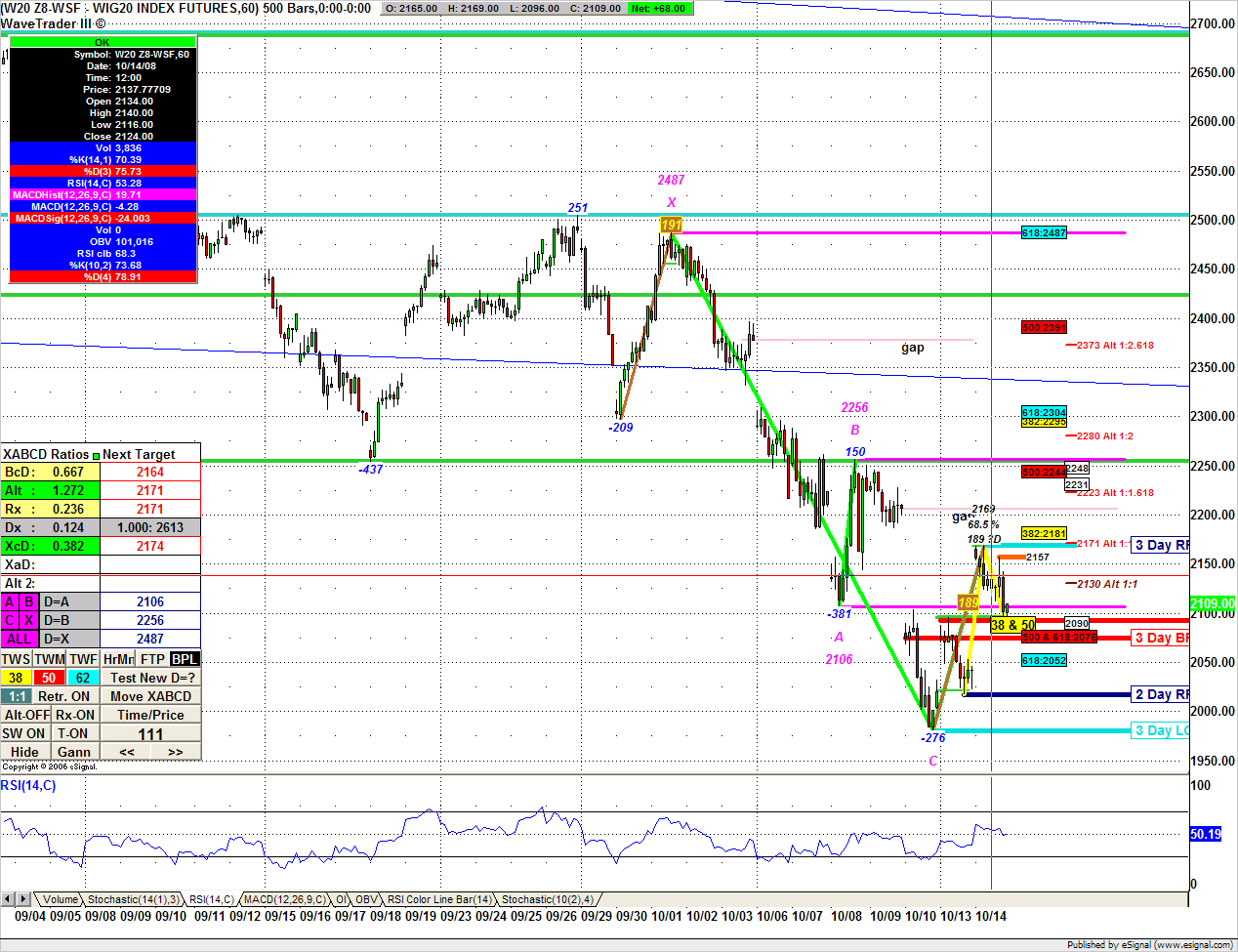 Albo wersja, gdzie abc jest częścią A w trójkącie ABCDE. Niby pasuje, bo wzrost pokrył 38.2% ostatnich spadków. Oznacza to spadek 3 falami do co najmniej 2050.