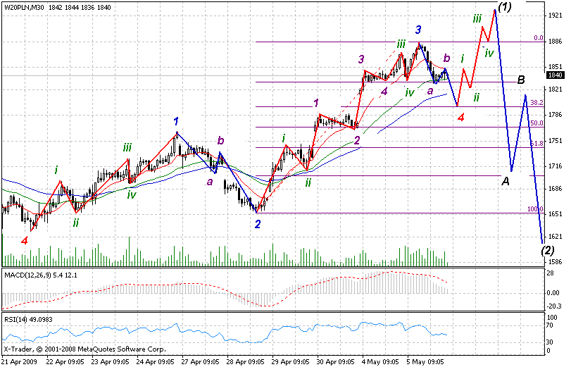 Dzis wykonczylismy czerwona 3 z mojego wykresu kilka postow wyzej.Teraz oczekuje spadkow do 1800pkt.Oprocz aspekto psychologicznego tam jest wzniesienie 38,2% fali 3.Kolejne wsparcie to 1770 ale 1800 jest bardziej prawdopodobne.