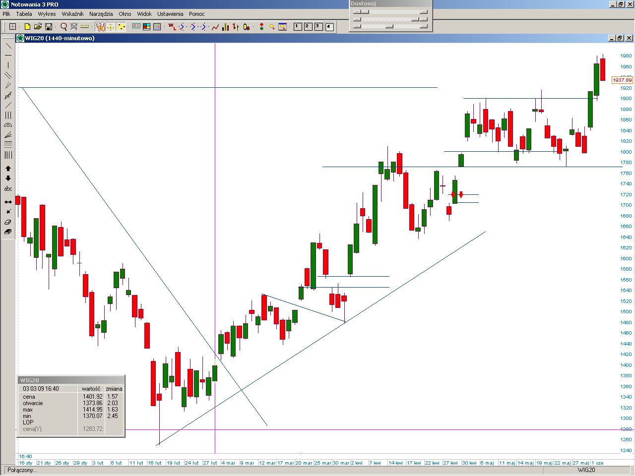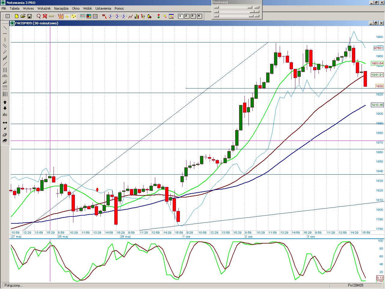 wreszcie mały oddech dla misiaczków i pierwsza od kilku dni czerwona świeczka. Na razie ona o niczym nie przesądza, co prawda na indeksie na day mamy formacje zasłony ciemnej chmury , ale do jej realizacji potrzebny jest powrót poniżej 1900 pkt. Na fw20 na wykresie intra rysuje sie podwójny szczyt, ale należy poczekać do pełnego ukształtowania formacji. Na razie nie pozostaje nic innego jak czekać, przewaga kupujących jest miażdząca i w każdej chwili możemy zobaczyć nowe szczyty. System tym razem nie załapał się na ruch w górę i pozostał poza rynkiem. Obecnie szykuje się do pozycji es:))))