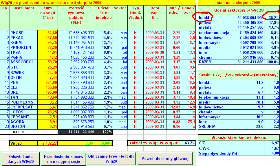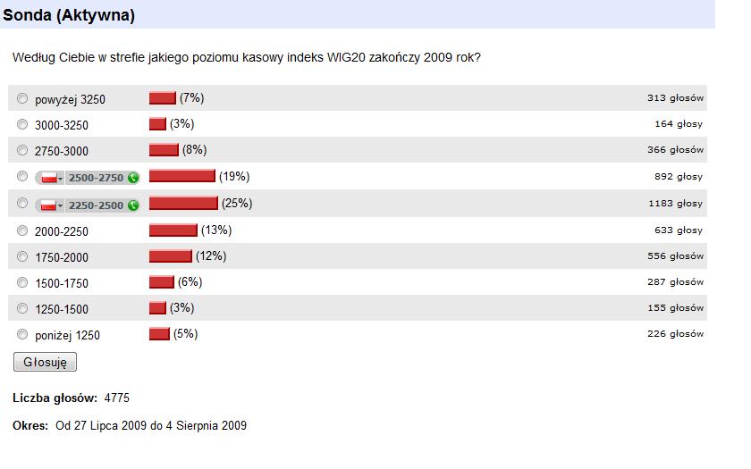Dzisiejszą sesję sponsoruje literka "P" jak PeKaO. Wyniki półroczne podane przez ten bank mocno rozczarowały inwestorów, którzy sypali akcjami bankowego lidera jak piachem w bycze oczy. Rozpoczął się sezon wyników. Czy będzie on łaskawy dla gpw? Większość analityków wskazuje na to, że tak. Drugi kwartał ma być jeszcze dobry. Ochłodzenia euforii powinniśmy się spodziewać w 3 i 4 kwartale czy rynek wyprzedzi prognozy zobaczymy. Patrząc na ankietę na stooqu oczekiwania są dość spore.