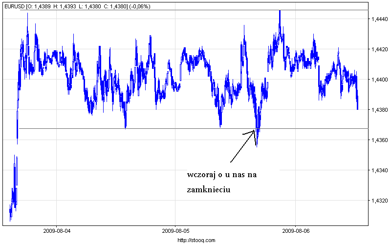 Z innej beczki - bardziej doswiadczeni ode mnie traderzy pewnie juz to wiedza, ale chcialbym sie podzielic pewnymi spostrzezeniami. Moja uwage zwrocila para EUR/USD i zaleznosc ruchow na rynkach papierow wartosciowych w stosunku do niej. Zwroccie uwage na wczorajszy zjazd w okolicach godz. 16:30. Mysle, ze wybicie z boczniaka tej pary moze nam dac bardzo istotna wskazowke w stosunku do dalszego rozwoju sytuacji na gpw.