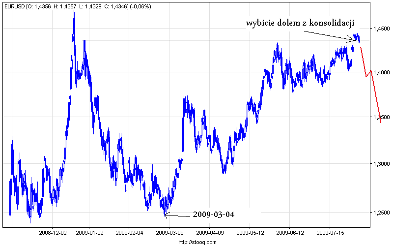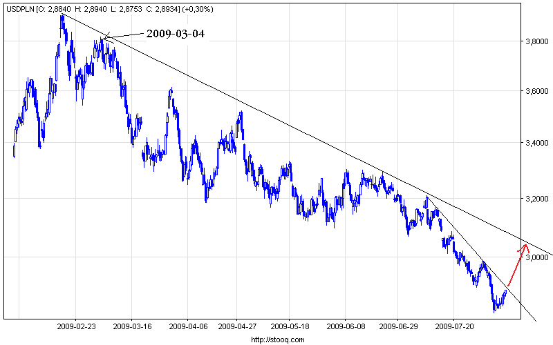 Pozwole sobie napisac male co nie co na temat walut, ktorymi sie dzisiaj zainteresowalem. Fajnie wychodzi EUR/USD vs USD/PLN. Na EUR/USD dolek byl w dniu 2009-03-04, na USD/PLN gorka(lokalna, bo max byl po info. o wycofaniu sie Goldmana ze spekulacji na PLN), w tym samym dniu. Dodatkowo EUR/USD wybilo z konsolidacji dolem. Czyli co powinno sie teraz stac? USD/PLN powinien wrocic do trendu wzrostowego. A co na to nasza wgpw? Niestety, ona nie lubi oslabiajacej sie naszej waluty.