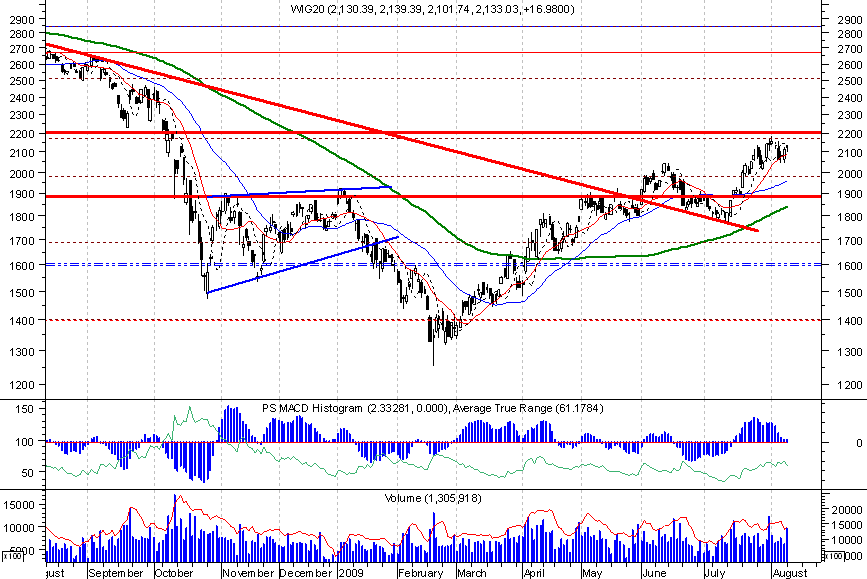 Technicznie od dłuższego czasu na wykresach nic się nie zmienia. Mógłbym dokładnie powtórzyć komentarz z przed dwóch tygodni (http://ifutures.pl/2009-komentarze-sesji-t2183.html). Silny opór na 2200 sprzyja budowaniu prawego ramienia małego RGR. Jest coraz więcej chętnych do grania na spadki. Autorytety mówią, że bez ponad 20% korekty się nie obejdzie. Tylko nie sposób zgadnąć od jakiego poziomu ta korekta może się zacząć. Na razie byki wstrzymały ofensywę ale misie nie korzystają z okazji na odrabianie strat. To oznacza ich słabość i prawdopodobieństwo załamania kolejnego RGRa rośnie. Wniosek: mimo wykupienia to jeszcze nie czas dla krótkich.