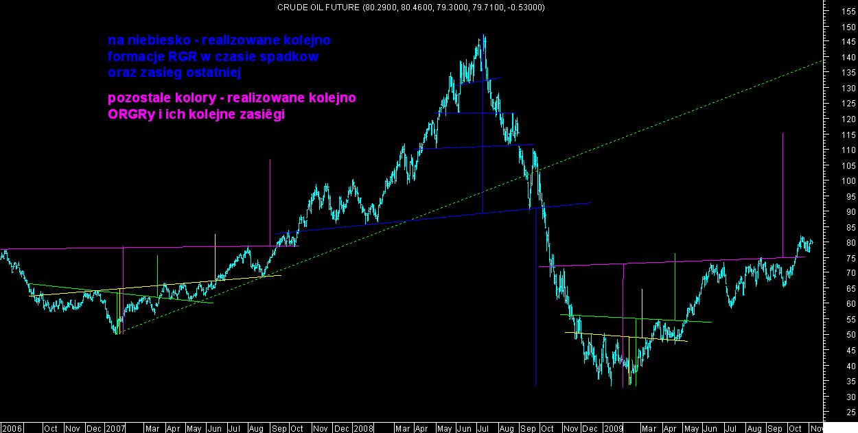 Na es.f po raz czwarty od sierpnia po długiej czarnej świecy zwiastującej zawał rynku, następują zwroty i w ciągu 4 sesji czarne świece są zakrywane. Teoretycznie sugeruje to nowe szczyty w tym roku. Natomiast warto mieć w pamięci, ze długie białe świece (takie jak wczorajsza) z kolei, powodowały conajmniej przystanek na kilka sesji. Być może w ocenie, czy jedziemy na szczyt, pomocne będzie spojrzenie na crude oil, gdzie ostatnie spadki były ruchem powrotnym do kolejnego orgra. Załamanie formacji (spadek <75) skomplikuje wzrostowy scenariusz.