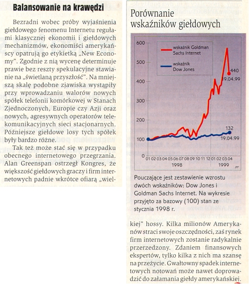 Przeglądałem archiwalny PC Kurier, sprzed 10 lat, czerwiec 1999. Pomijając reklamy palmtopów z 4MB RAM na pokładzie:))) jest artykuł pisany przed pęknięciem bańki internetowej. Ciekawe sformułowania i słowa, jakby teraz pisane... tu fragment.