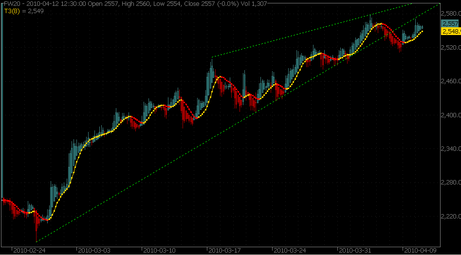 ...kontrakt FW20 po wybiciu nowego szczytu w trendzie trwajacym 14 miesiecy przetestowal poprzednie szczyty. Pojawienie sie zdecydowanego popytu na poziomie poprzednich wierzcholkow (a nie dolkow) wskazuje na sile obecnego trendu. Rynek w USA rowniez wybija nowy szczyt, tym samym podtrzymujac niemal podrecznikowa zwyzkowa tendencje. Najblizszych oporow FW20 upatrywalbym w strefie 2578-81 i wyzej 2598-260x. Istotne wsparcie na poziomie 2510 i 16-20.