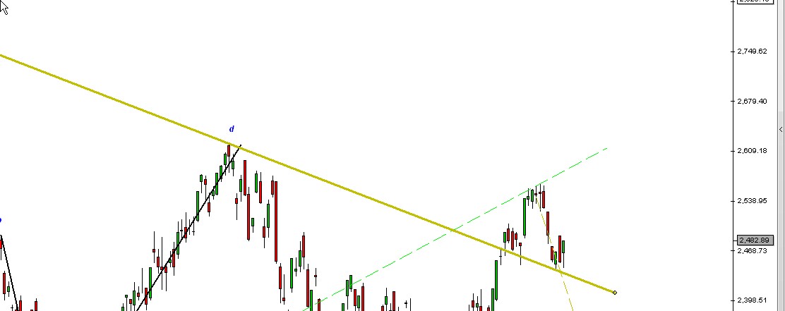 Na Warsaw Stock Exchange trzy ostatnie dni to próba złapania oddechu w intradayowym kanale spadkowym (próba która doprowadziła do niewielkiego wyjścia górą z kanału, patrz czart, subiektywnie) niestety wczorajsza sesja w Stanach skończyła się w sposób tak niejednoznaczny, że zapewne równie dobre argumenty znajdą dla siebie optymiści jak i pesymiści ;-) co w mojej ocenie będzie skutkowało półeczki ciągiem dalszym z możliwym 10 punktowym pogłębieniem dna, poziom 2430 o którym kilka dni temu wspominałem przesunął się już trochę wyżej 2440 - czart drugi