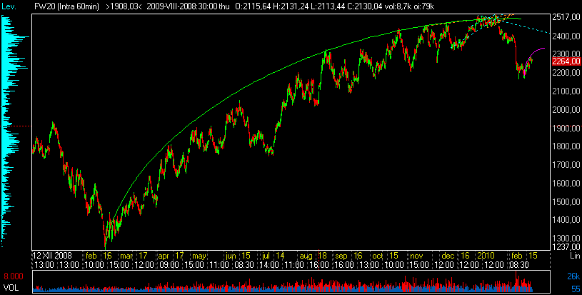 U nas ciąg dalszy solidnych wzrostów jednak teraz chyba nie będzie już tak łatwo. Dzisiejsza sesja w USA pozwoliła zbliżyć się SP do kluczowego oporu. U nas (przynajmniej na moich kreskach) także opornie to wygląda. 100 pkt od dołka zrobione wszystko się układa w klasyczne łapanie górki. Ale jak wszyscy dobrze wiemy nie sposób pogodzić podążania z trendem z braniem pozycji przy oporze. Kupuj plotki sprzedawaj fakty, pozwól zyskom rosnąć i tnij straty. Takie rzeczy to tylko w filmach.