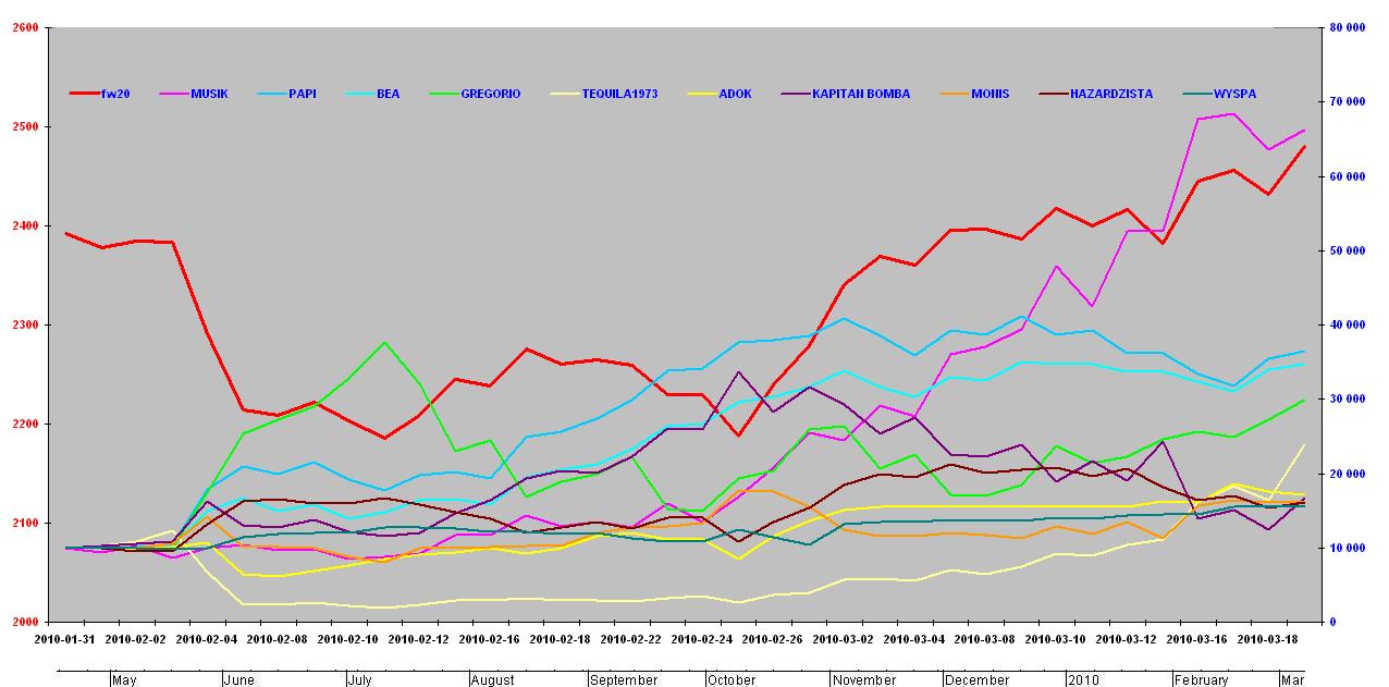 Na wstępie trzeba przypomnieć co było 3 m-ce temu. Wówczas podczas rolowania na serię H ujawniło się 2 zawodników o składzie portfela 50-55% i 35-40%. Ilość futów świadczyła o pozycjach przeciwstawnych co poźniej się potwierdziło. Jeden inwestor trzymał spekulacyjne L a drugi S - prawdopodobnie z pozycji arbitrażowych. Pomimo przeciwstawnych pozycji obydwaj cały czas grali do jednej bramki, gdyż arbitrażysta otwierając pozycje (S na fw) kupuje jednocześnie kosze akcji na indeksie. Ponadto większą część pozycji w grudniu obydwaj rolowali między sobą. Największą ilość pozycji (39-44k) posiadali na przełomie 2i 3 dekady stycznia. W tym czasie wystąpił szczyt poprzedniej fali wzrostowej. Od tego czasu obydwaj redukowali pozycje "znikając" w połowie lutego z komunikatów o koncentracji. Od początku marca, czyli okresu początku obecnej fali wzrostowej jeden z nich ujawnił się ponownie powiększając pozycje do ok. 30 k.