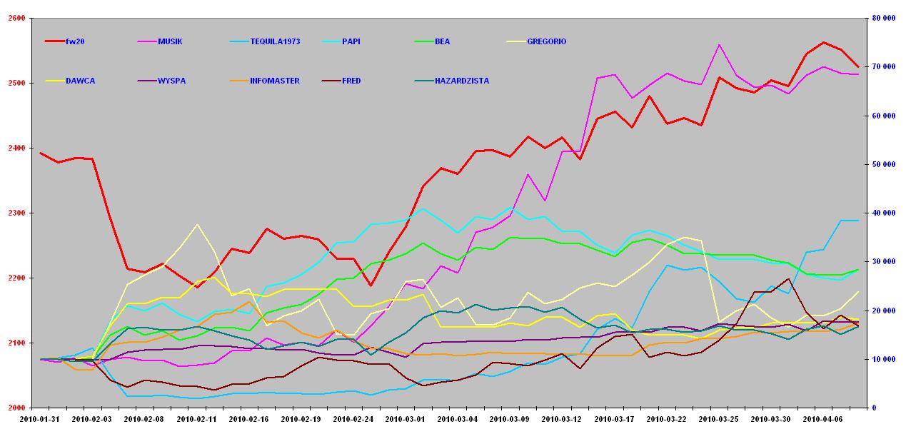 Dwudniowe spadki przełożyły się pozytywnie na wyniki Pakietowiczów. W środę i czwartek zyskało po 83 graczy, wobec 52 i 49 tracących ( nie grało 103 i 106 graczy). Łączny kapitał na ostatnich dwóch sesjach wzrósł o 0,48% i 0,67%. Na plusie było odpowiednio 50 i 53 zawodników, traciło kapitał 166 i 163.