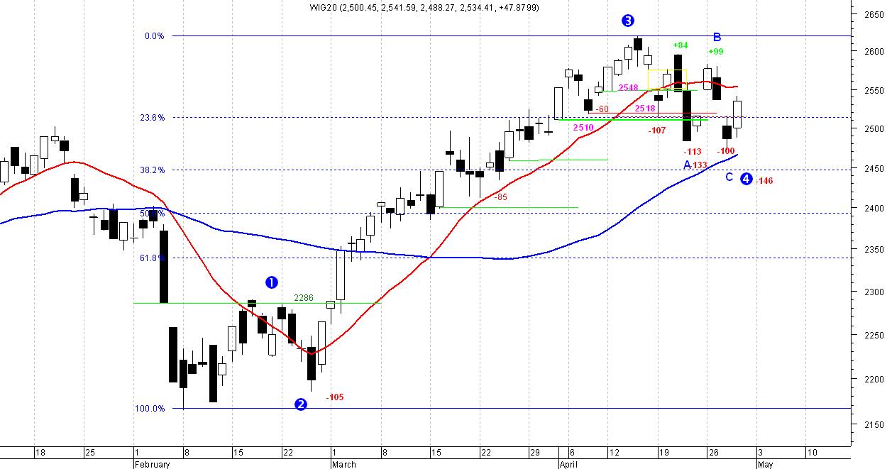Ta sytuacja spowodowała falstart niedżwiedzi na gpw i wczorajszą kontrę byków. Ponieważ pierwsza spadkowa fala była trójką, można wstępnie zakwalifikować ją jako A, co po zrobieniu nowego dołka w środę daje nadzieję na wypełnienie fali 4 (oznaczenie na wykresie w20-daily).Oznaczenie alternatywne zakłada natomiast, że fala B dalej się rysuje, a wczorajszy wzrost jest podfalą c w B w 4 lub jakimś odbiciem w C. W tym przypadku możliwy byłby ponowny test dołka.