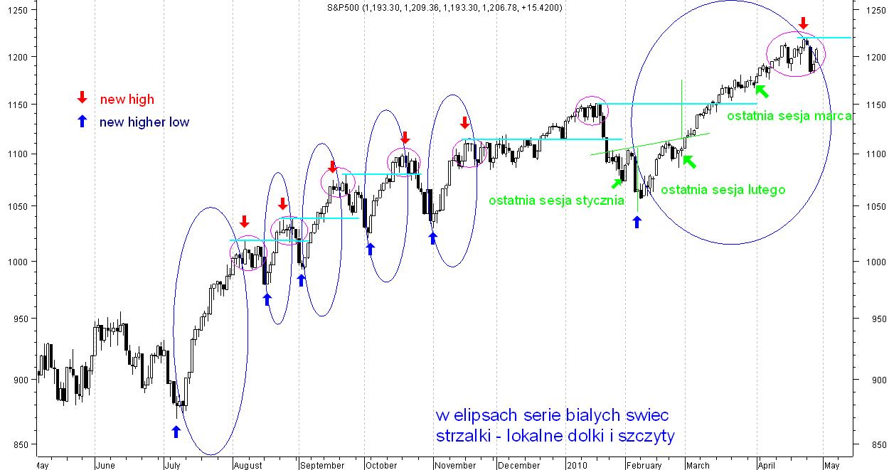 Charakterystyczne dla rynku w USA jest to, że nawet po dużych wzrostach, nie chce spadać bez wcześniejszej konsolidacji (różowe kółka na wykresie SP500). Opisywał to swego czasu skippy,a ma to zapewne związek z płynnością na tym rynku.