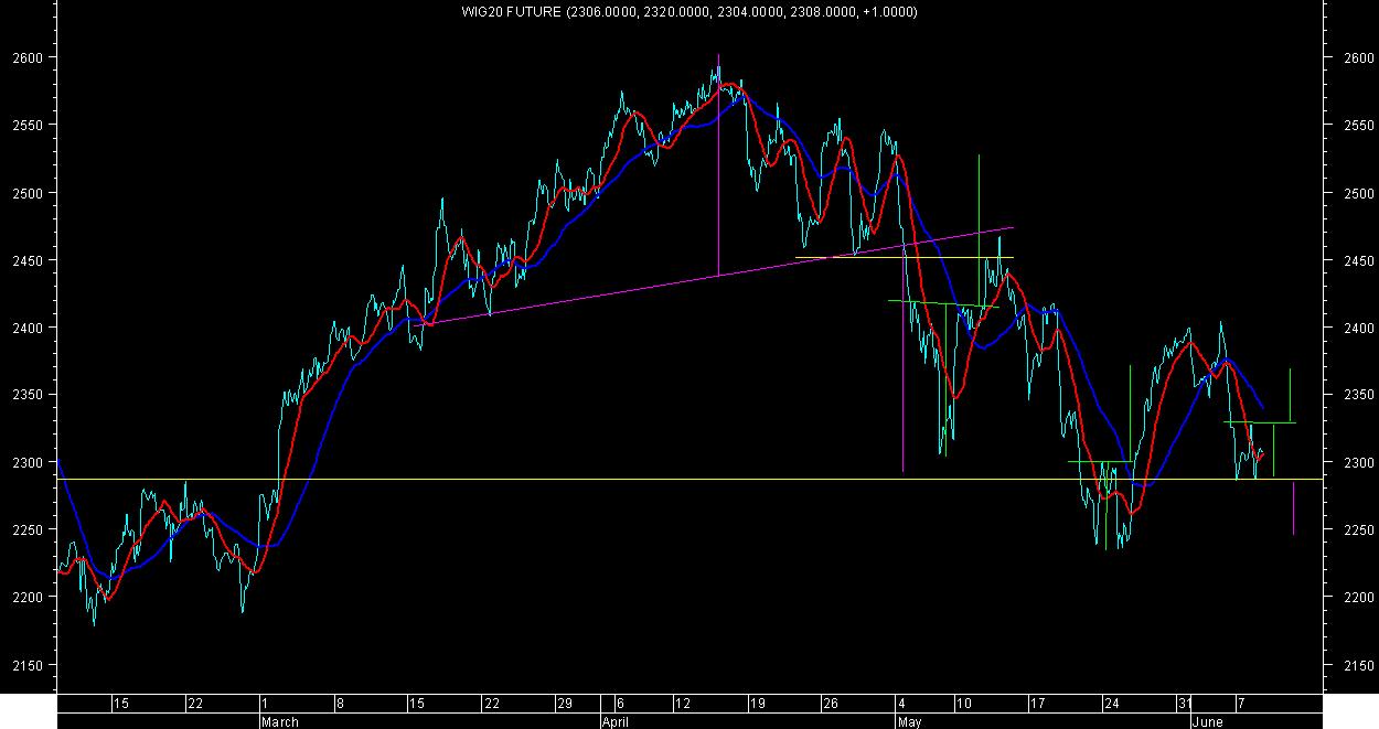 Duże obroty na indeksie w pobliżu wsparć pokazują, że pojawili się chętni do obrony rynku i dają nadzieję na (przynajmniej) korektę ostatniej fali spadkowej. Wybicie futa powyżej 2330 dałoby nadzieję na próbę wymalowania na intra podwójnego dna.