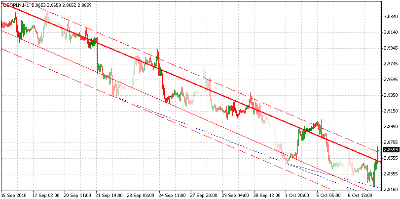 USDPLN znowu atakuje opór, tym razem nie zaliczył dołu kanału ani nawet wewnętrznej.