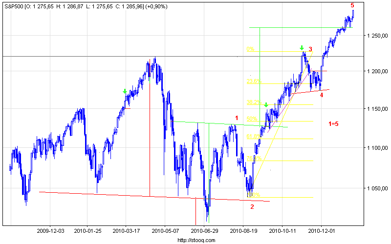 Prokorekcyjne nastroje wydają się być ciągłym paliwem do wzrostów. SP500 ponownie wybił się długą białą, świecą co może spowodować jakiś przystanek i ponowne tankowanie paliwa. Indeks zatrzymał się na ważnym dla szorciarzy poziomie równości fali 1 i 5.
