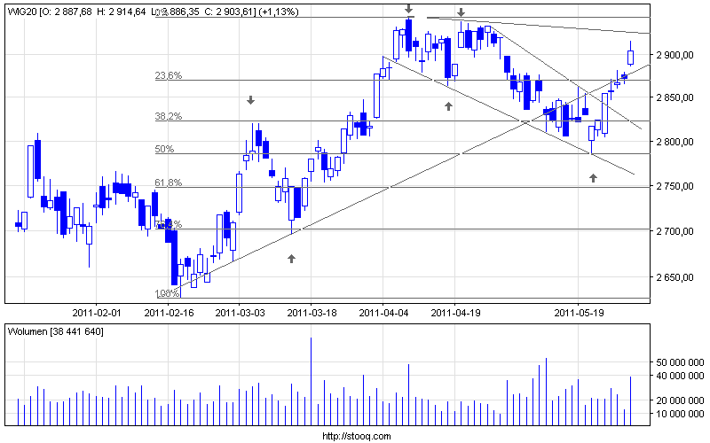 Patrząc szerzej możliwe że była to fala 2w5 więc jeśli mamy do czynienia z 3, przekopanie szczytów będzie potwierdzeniem tego założenia. Rosnąca LOP przy rosnących cenach nieźle wróży na najbliższe spotkania, rzekłbym bez testu spadkowej się nie obędzie, a test szczytów (2942 na indeksie) także niewykluczony. Poziomy dość istotne z racji 61,8 całej bessy. Siła rynku zastanawia, ale na Titaniku orkiestra też grała do końca :)