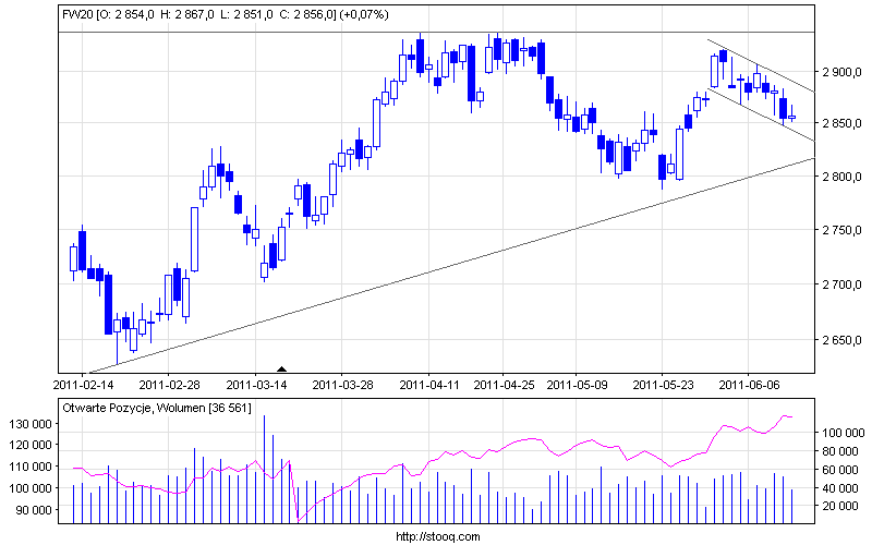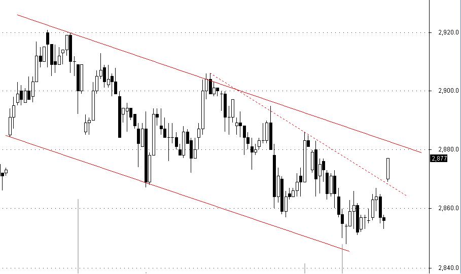 Jak widać na wykresie od trzech sesji trwa obrona okolic 2850 a od kilku więcej jazda w gustownym kanale. Od góry i od dołu kolejne poziomy wsparcia albo oporu (czytaj: nadziei