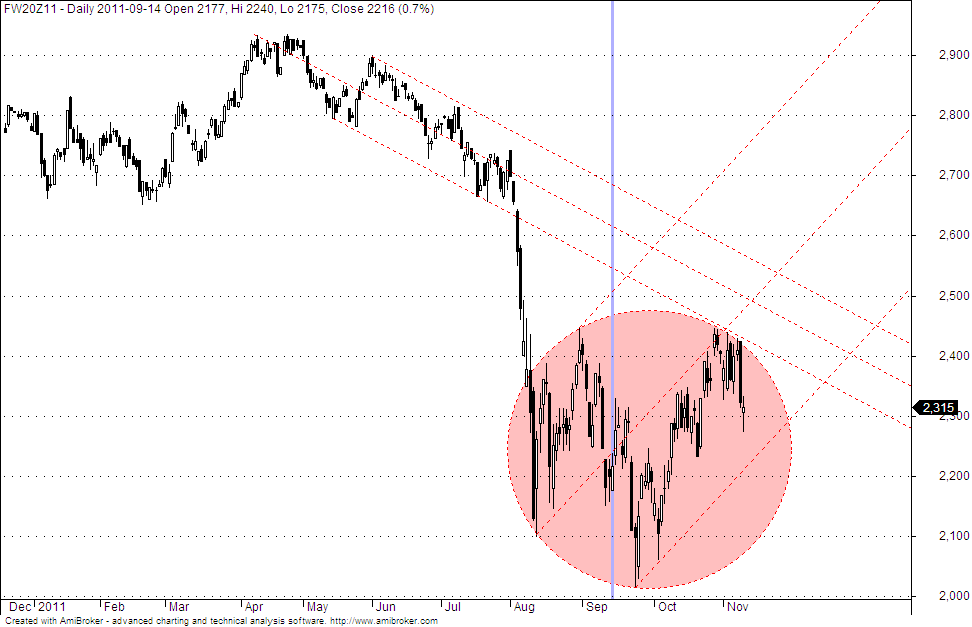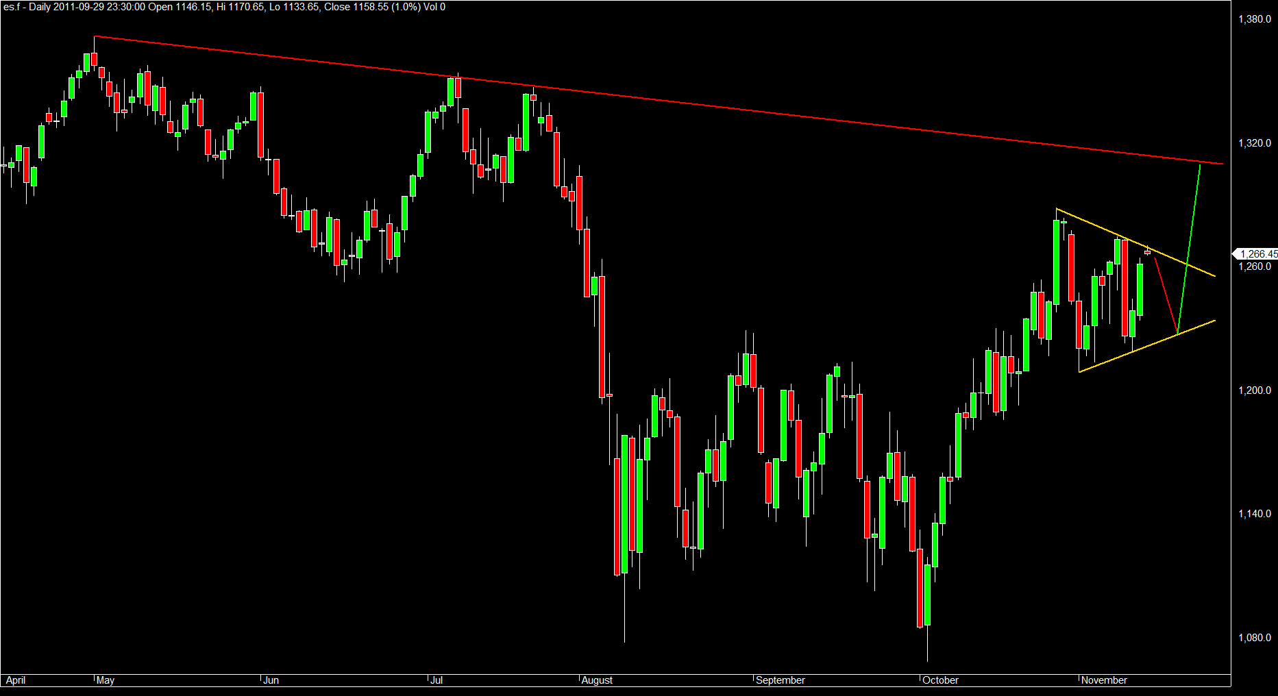 Na kresce dziennej es.f zarys trójkąta symetrycznego , do jego pełnego utworzenia brakowałoby zmyłki w dół :) na dolne ograniczenie formacji. Jakby jednak na to nie spojrzał formacja zapowiada kontynuację ruchu wzrostowego w obecnym układzie.