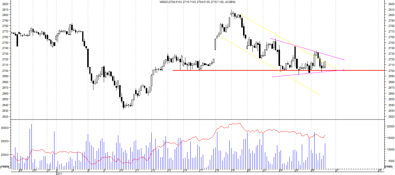 Ostatnie zachowanie w20 jest nietypowe. W środę na wykresie godz. indeks rósł na dużych obrotach (zdrowy objaw), po czym spadał pod własnym ciężarem (czyli na małym obrocie) znosząc całkowicie wcześniejszy UP. Teoretycznie powinno dziwić, ze ktos wykłada kasę, po czym odpuszcza i pozwala rynkowi spadać poniżej cen zakupu (fix został już podciągnięty).