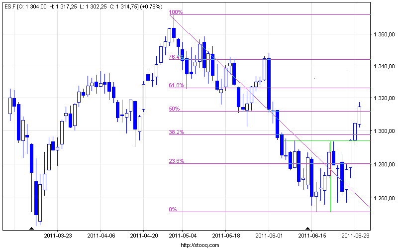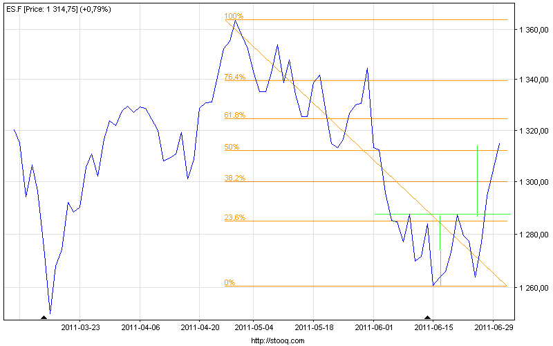 Na wykresie liniowym es.f zrealizował już zasięg minimalny wynikający z orgra, co potwierdza zmianę sentymentu na rynkach. Dynamikę wzrostów trzeba uszanować, gdyż niemal 2-miesięczne spadki zostały zniesione >50% w 4 dni.