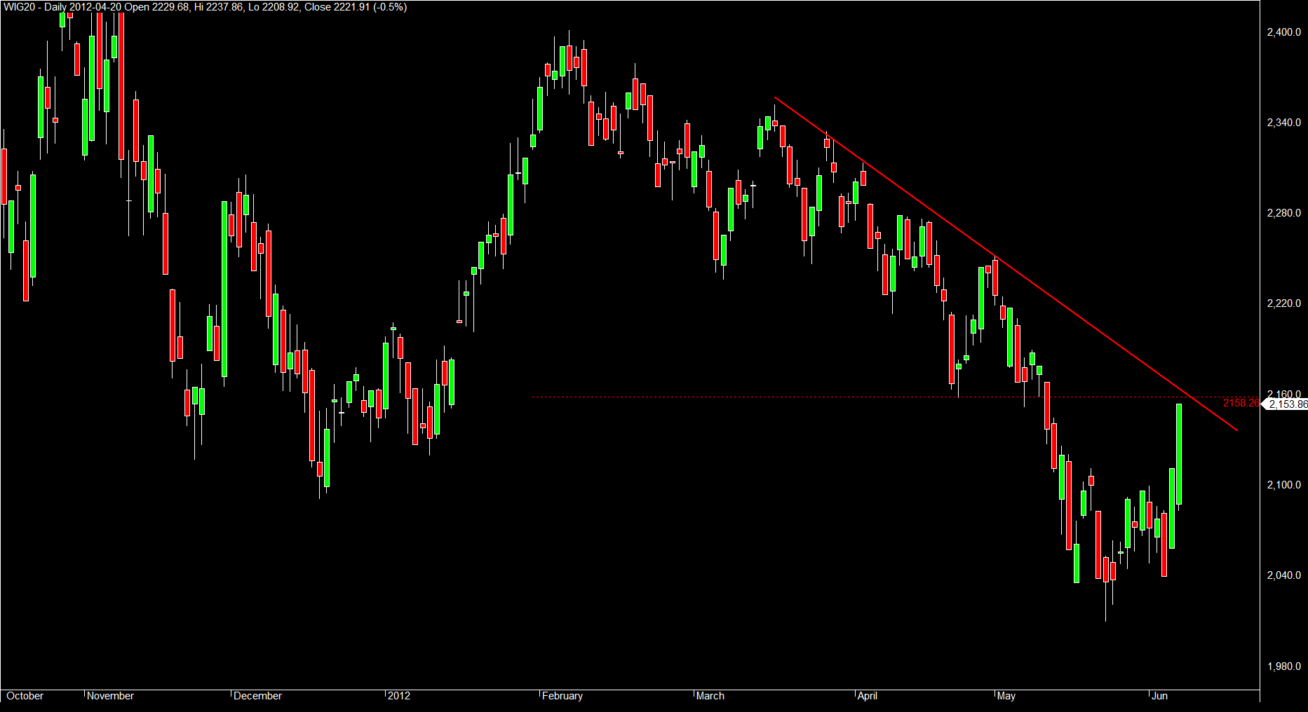 Rynek uporał się z harami z wykresu tygodniowego, wybicie formacji jest faktem. Jeśli świeca dzienna zamknie nam się poniżej poziomu wybicia tj. 2111 możemy mówić wstępnie o fałszywym wybiciu i liczyć się z jego konsekwencjami, nie mniej dopiero close świecy tygodniowej poniżej 2111 da obraz zasadniczej formacji fałszywego ruchu. Na razie jednak mamy świecę dzienną z wyraźnie większymi od średniej obrotami na szerokim rynku co stwarza przesłanki na kontynuacje ruchu. Najbliższa kłoda dla popytu to poziom kreski trendowej wzmocnionej oporem 2158.