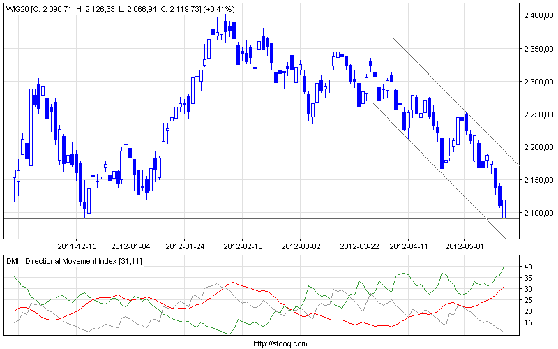 Początek dzisiejszej sesji przyniósł lukę spadkową i wyraźne naruszenie strefy wsparć 2090-2120. Dzięki takiemu początkowi zagościliśmy na GPW dawno niewidziany popyt, który wyraźnie większymi obrotami doprowadził do zamknięcia sesji na plusach. Wciąż jednak pozostajemy we wspomnianej strefie wsparć i w trendzie spadkowym, więc zapał ewentualnych byków może zostać szybko zgaszony.