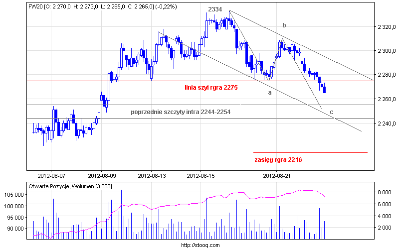 Wydarzeniem środowego spotkania było przegrzebanie 2275 co automatycznie wiąże się z wyrysowaniem rgra z zasięgiem 59 pkt w dół czyli 2216. Jednak nie jest to preferowany scenario na najbliższe godziny.