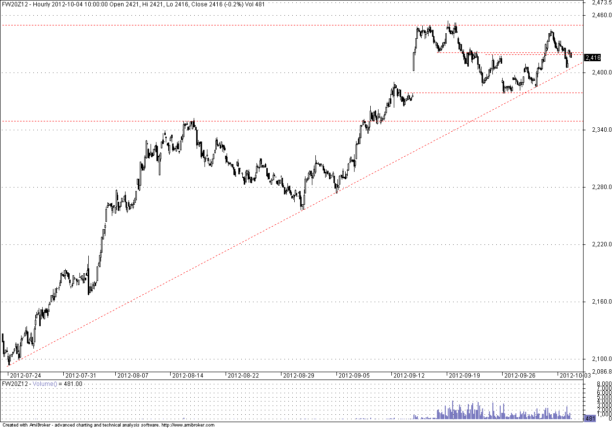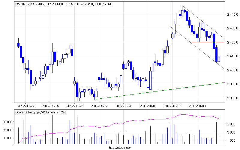 Spadek poniżej 2410 pogrzebał optymistyczną wymowę korekty z którą mamy do czynienia obecnie. Osuwamy się w kanałku który widać na obrazku (fut 1h), pierwszym oporem futa jest 2420 i sam kanałek.