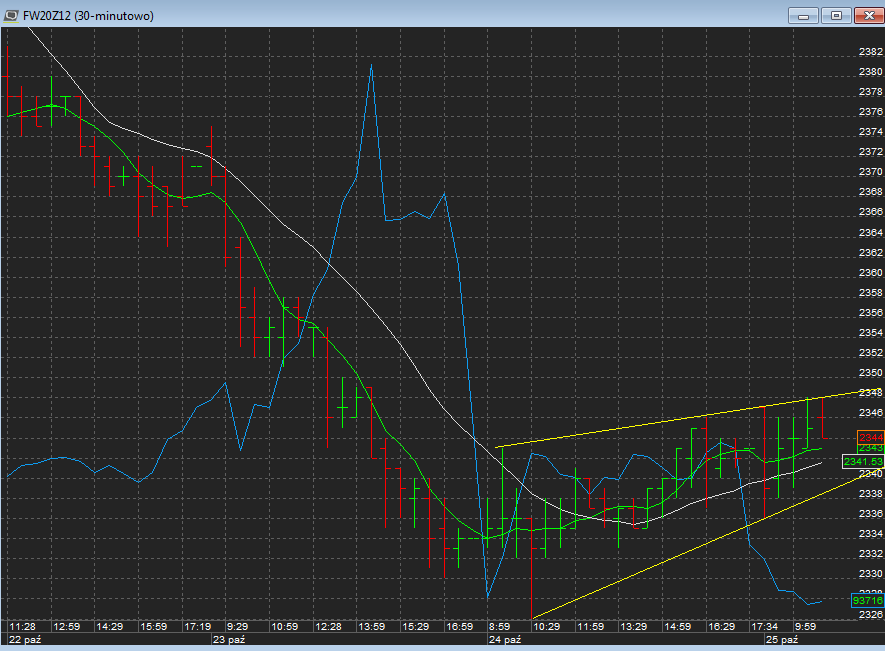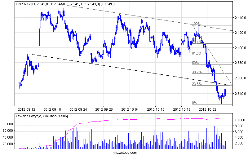 Najszybszymi opornikami dla pierwszego wariantu są kreska trendowa, połowa świecy z wtorku i pierwszy fibon 23,6 - wszystko w okolicach 2350 na fucie i do momentu ich pokonania obowiązuje wariant drugi.