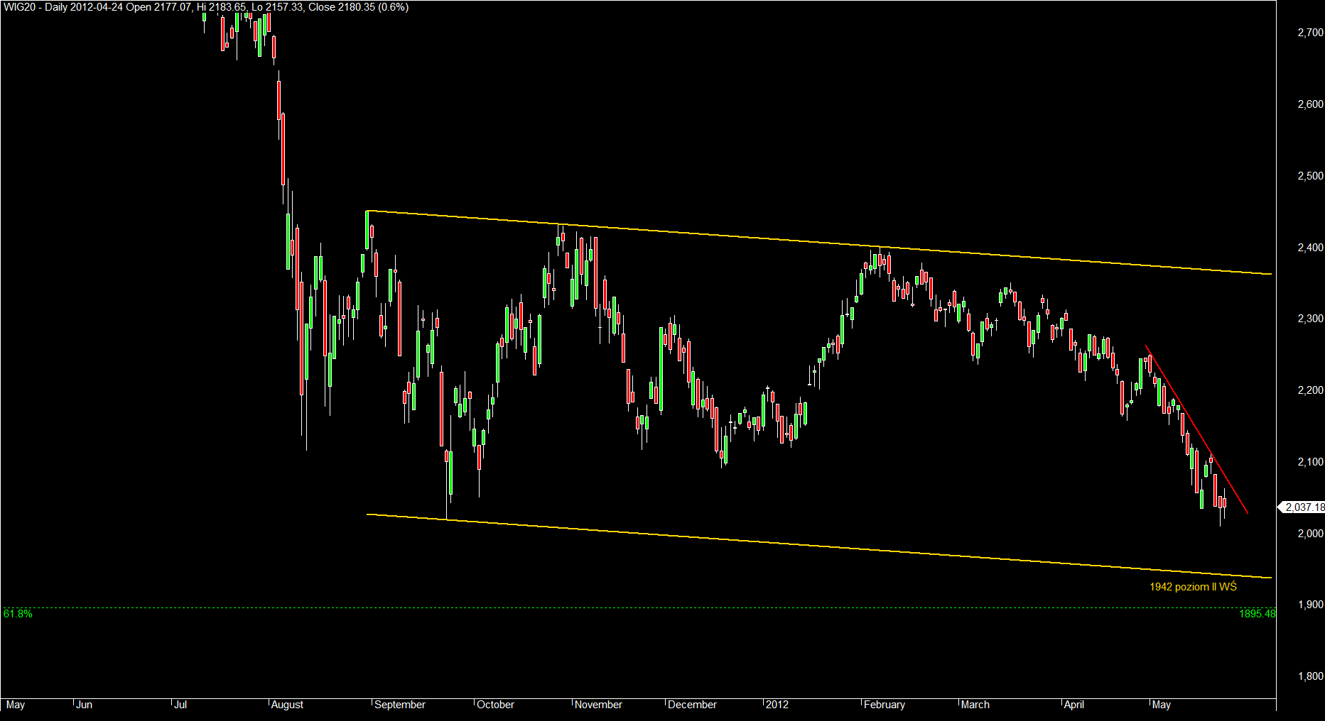 Od strony kresek możemy zaryzykować tezę kanału wirtualnego z dolnym ograniczeniem w pobliżu daty z II Wojny Światowej czyli 1942 , po wyjściu dołem z w/w formacji czeka 62 % fibo na poziomie daty z poprzedniego wieku na 1895 r. Obecnie cena zatrzymała się w orbicie minima lokalnego (patrz na lewo) na 2018. Wskaźniki dzienne takie jak RSI czy momentum zgłaszają dywergencję byka. Najbliższym bastionem do zdobycia dla popytu jest szybka kreska trendu spadkowego obecnie poziom ok 2065. Zamknięcie sesji na rynkach cywilizowanych tj.DJ i SP500 nie wygląda optymistycznie na start w poniedziałek ale co ostatnio wygląda optymistycznie i to raczej nie jest nic nadzwyczajnego