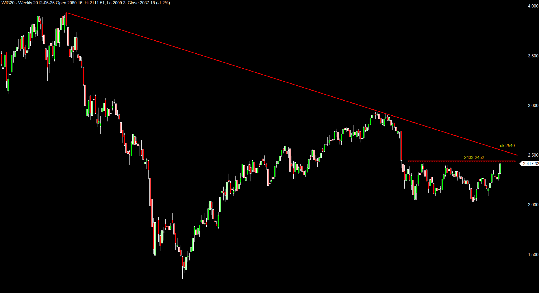 Póki co jesteśmy praktycznie na górnym ograniczeniu ponad 1.5 rocznej konsolidacji z szansą na jej wybicie i dotarcie do długoterminowej linii trendu spadkowego. Ta linia jednak przypomina gdzie jest aktualnie nasze miejsce w szeregu. W porównaniu do rynków cywilizowanych gdzie praktycznie została już symboliczna odległość do zniesienia w 100 % ostatniej bessy, wypadamy bardzo blado . Hossa zapomniała o naszym rynku , ale może św Mikołaj przywiezie ją z dalekiej Grenlandii :mrgreen: