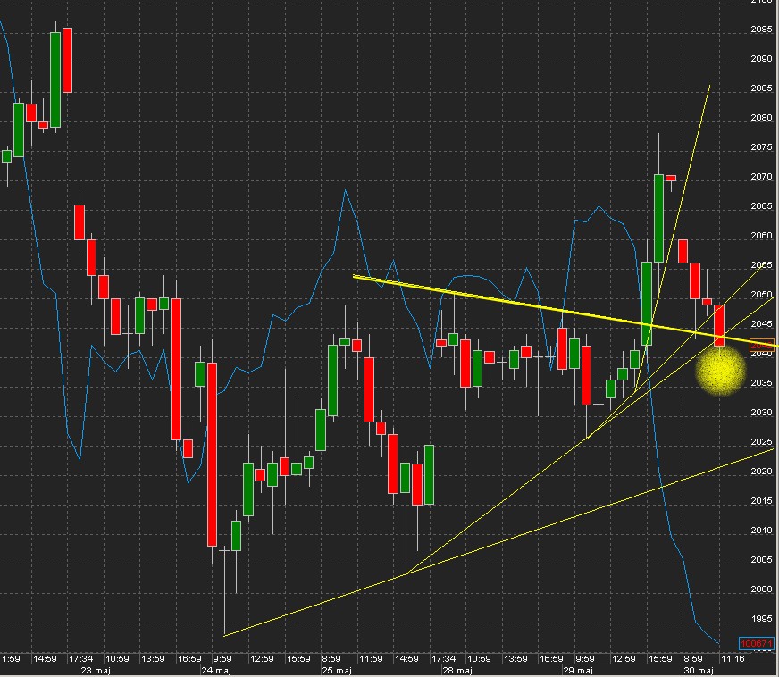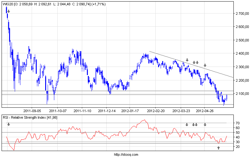 Podaż nie poszalała :-) Po chwilowym zejściu RSI w strefę wyprzedania i teście minimów wielomiesięcznej konsolidacji W20 znów znalazł się tuż pod strefą 2090-2120, a dynamiczny ruch RSI sygnalizuje, że tym razem strefa ta zostanie pokonana.