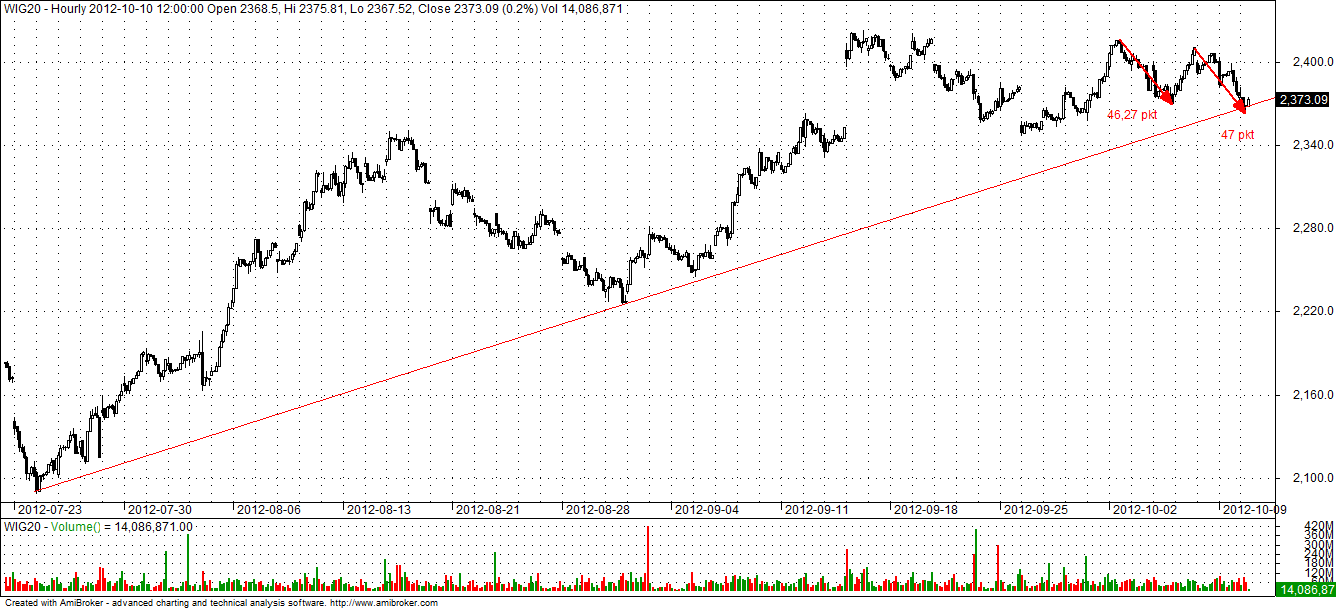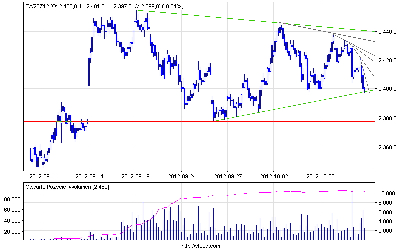 Spadkowa sesja na większym niż ostatnio obrocie mówi wszystko. Co prawda sygnalizowane wczoraj pierwsze wsparciątka nadal trzymają ale jak się stany się nie wybronią to możemy w środę odejść luką na open, co powiezie cudem uratowane dziś czwartkowo –piątkowe miny 2399 (mała czerwona kreska) oraz spowoduje wyjście dołem z trójkąta (zielone kreski) i widzimy się na 2378 pkt gdzie zapewne powalczymy trochę z powodu luki i bardziej kluczowych minimów (duża czerwona kreska).