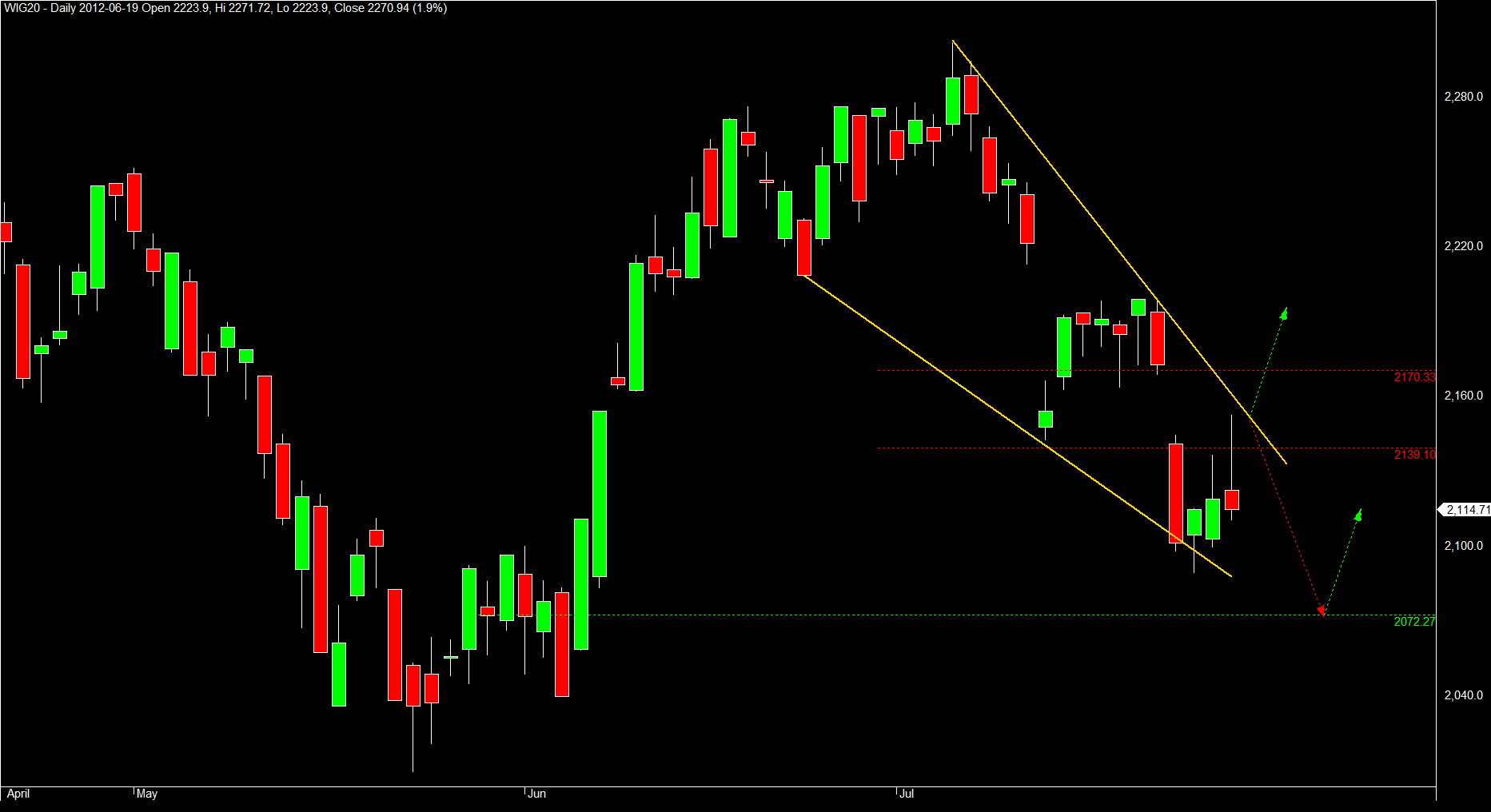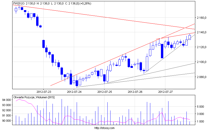 Na wykresie oznaczyłem przykładowe zarysy ruchów z jakimi możemy mieć do czynienia. Choć możliwości na wykresie jest więcej :) Zarys klina wspiera obóz optymistów . Jutro rynki wyczekiwać będą na odczyt PKB w USA, w kuluarach oczekuje się pesymistycznych danych. Być może nasza reakcja na fixingu była odzwierciedleniem obaw o te dane.