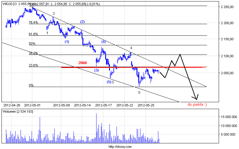 W wypadku przejścia 2066 na indeksie (co wydaje mi się prawdopodobne w ramach obecnej struktury korekcyjnej) który to poziom jest również 23,6% fibona całego ostatniego zejścia, mamy szansę na powiększenie ruchu do góry ale fajerwerków bym nie oczekiwał i kolejne 2100-2120 (okolice 50% fibona - rynek jest słabiutki) mogłoby zatrzymać zabawę. Nie zdziwi mnie odwrót w dół z poziomów niższych niż wspomniane 50% fibona.