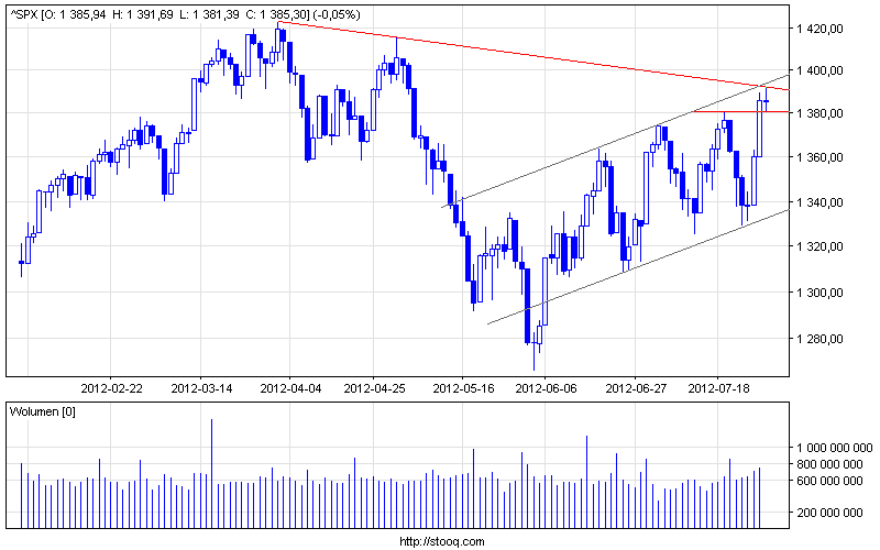 Za możliwością mniejszego bądź większego osłabienia przemawia dojście w okolice pierwszych ważniejszych oporów w interwale dziennym zarówno na miejscowym fucie (wykres nr 1), gdzie z kolei w interwale 1h rośniemy hiperbolką i klinikiem co z definicji jest niebezpieczne (wykres nr 2) jak i na amerykańskim sp500 gdzie doszliśmy do górnej bandy kanału a najszybszy sygnał es jest blisko i padnie już po zejściu pod 1380 pkta ( wykres nr 3).